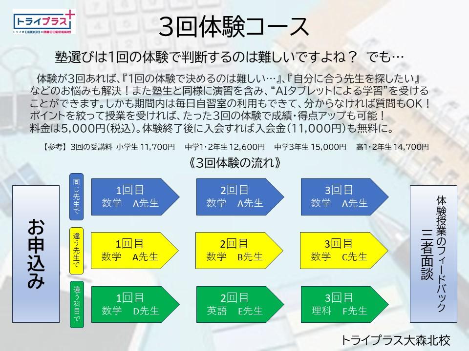 【3回体験コース】は入会金がかからず、3回の授業を受けることができます。講習のみの入会と比較して、生徒管理費も含んでいますので、通常の授業料と比べると小学生で約7,000円、高校3年生で約10,000円お得です。