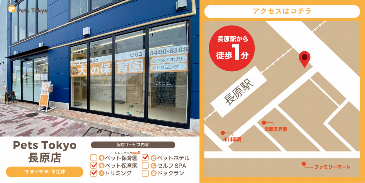 『Pets Tokyo長原店』は、ペットの「保育園」「トリミング」「ホテル」「物販」など、多彩なサービスを提供する複合型ケアスペースで、日常のケアから預かり、ケア用品の購入まで一ヶ所で完結できるのが特徴です。
