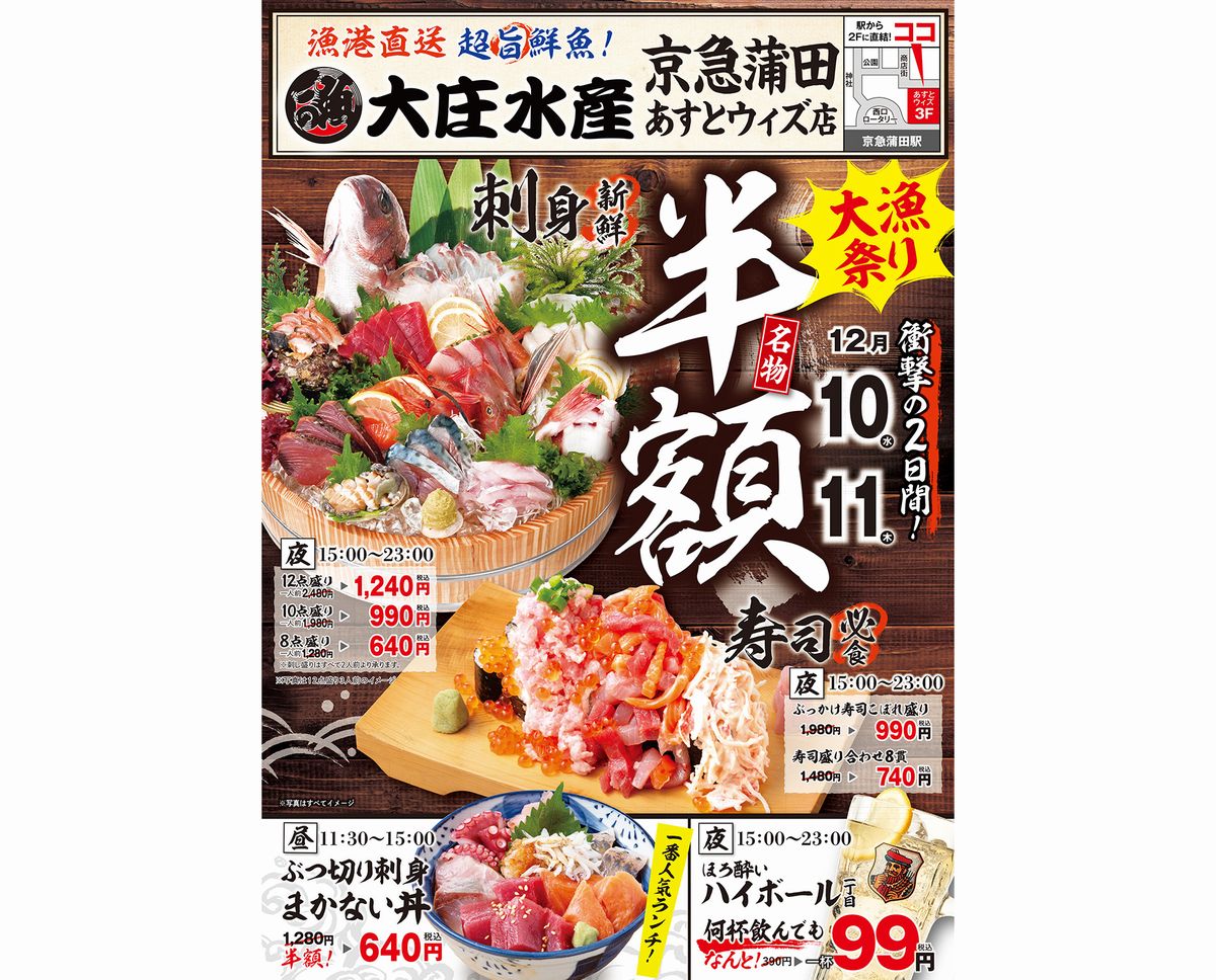 【大田区】12月10日、12月11日の2日間限定!『浜焼き海鮮居酒屋 大庄水産 京急蒲田あすとウィズ店』で、『名物“半額”大漁祭り』が開催されます!
